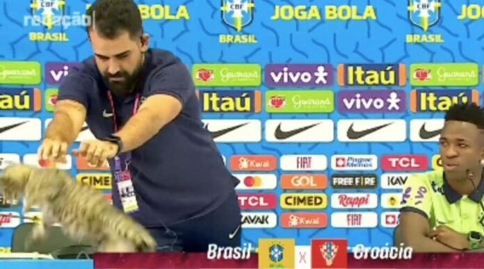 Brezilya Milli Takımı’nın basın sorumlusu, Vinicius Jr’ın muhabirlerle yaptığı söyleşi sırasında masada duran kediyi yere atınca herkes şaşkına döndü.