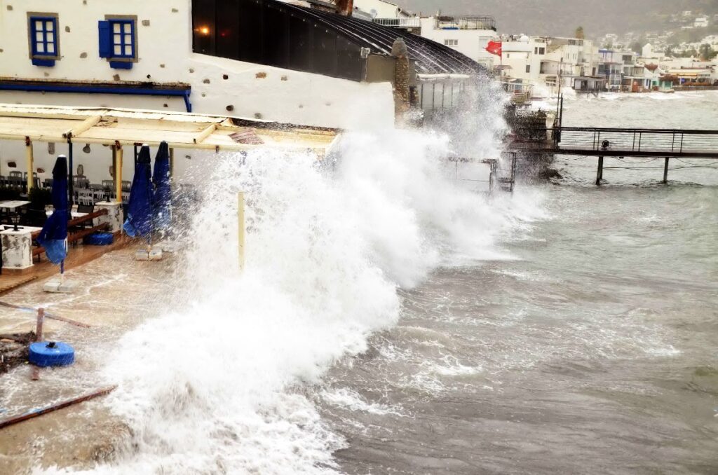 Muğla’nın Bodrum ilçesinde bugün sabah saatlerinde başlayan ve öğleden sonra sağanak yağış ile birlikte şiddetini arttıran şiddetli lodos nedeniyle turistik ilçede hayat felç oldu.