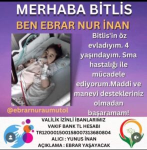 Bitlisli Ebrar Nur İnan’a SMA teşhisi henüz 35 günlükken konuldu.