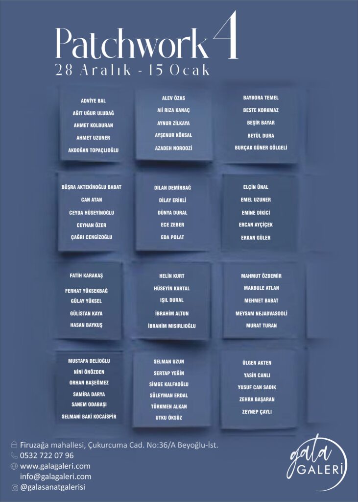 62 sanatçının katılımıyla gerçekleştirilecek olan “Patchwork lV” adlı karma resim sergisi 28 Aralık – 15 Ocak tarihleri arasında Beyoğlu Gala Sanat Galerisi’nde gerçekleşecek