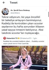 “Tekrar ediyorum; biz yaya öncelikli bir belediye anlayışını benimsiyoruz. Kadıköy’de kontrolden çıkan scooter sayılarının bu hafta sonundan itibaren yasal sayıya inmesini bekliyoruz. Aksi takdirde scooter’ları toplayacağız.”