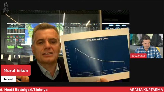 Turkcel CEO’su, şebeke sorununu anlatmak için yayına bağlandı, interneti kesildi!                                                                                                                                Merkez üssü Kahramanmaraş olan ve 10 ili vuran deprem felaketinde en çok konuşulan konulardan biri GSM operatörlerinin yetersizliği oldu. Binlerce depremzede, afetin ilk anından bu yana bölgeden yakınlarına ulaşmakta güçlük çekti.                                                                                                                                                              Depremlerin beşinci gününde bölgedeki iletişim sorunu hala devam ederken; konuyla ilgili gazeteci Cüneyt Özdemir’in YouTube yayınına bağlanan Turkcell CEO’su Murat Erkan, yaşanan problemleri anlattı.Ancak Erkan’ın internet bağlantısındaki kesinti gündem oldu. Turkcell operasyon merkezinden yayına bağlanan Erkan’ın görüntüsü zaman zaman dondu, sesinde kesilmeler meydana geldi.