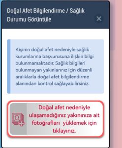 e-Nabız uygulamasındaki Doğal Afet Bilgilendirme alanına, kullanıcıların deprem nedeniyle ulaşamadığı 1. ve 2. derece yakınlarına ait fotoğrafları yükleme özelliği eklendi.