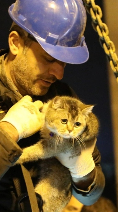 Enkazdaki “Zena” isimli kedi saatler süren operasyonla kurtarıldı.