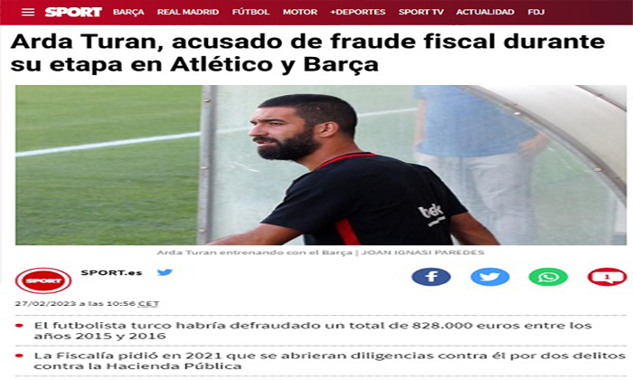 Katalan medyasının önde gelen gazetelerinden Sport, bir dönem Barcelona ve Atletico Madrid forması giyen Arda Turan hakkında vergi suçu iddiasıyla soruşturma başlatıldığını yazdı.