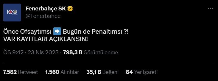 Resmi Twitter hesabından açıklama yapan sarı-lacivertli kulüp, “Önce Ofsaytımsı, bugün de Penaltımsı ?! VAR KAYITLARI AÇIKLANSIN” ifadelerini kullandı.