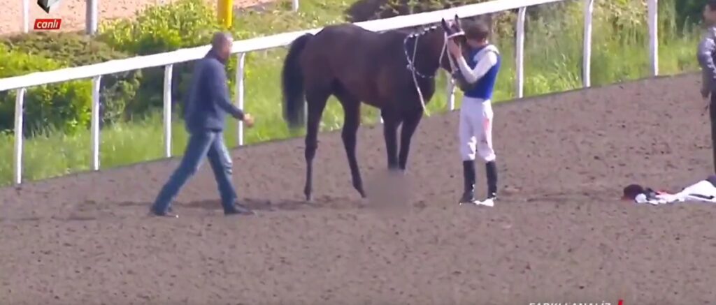 Son düzlüğe orta kulvarda rakiplerinin önünde çıkan ve son 400 metreyi de kolay bir tempoda önde geçen klas tay, bu metrelerde tökezledi ve hemen akabinde de ayakta duramayarak jokeyi ile birlikte yıkıldı.