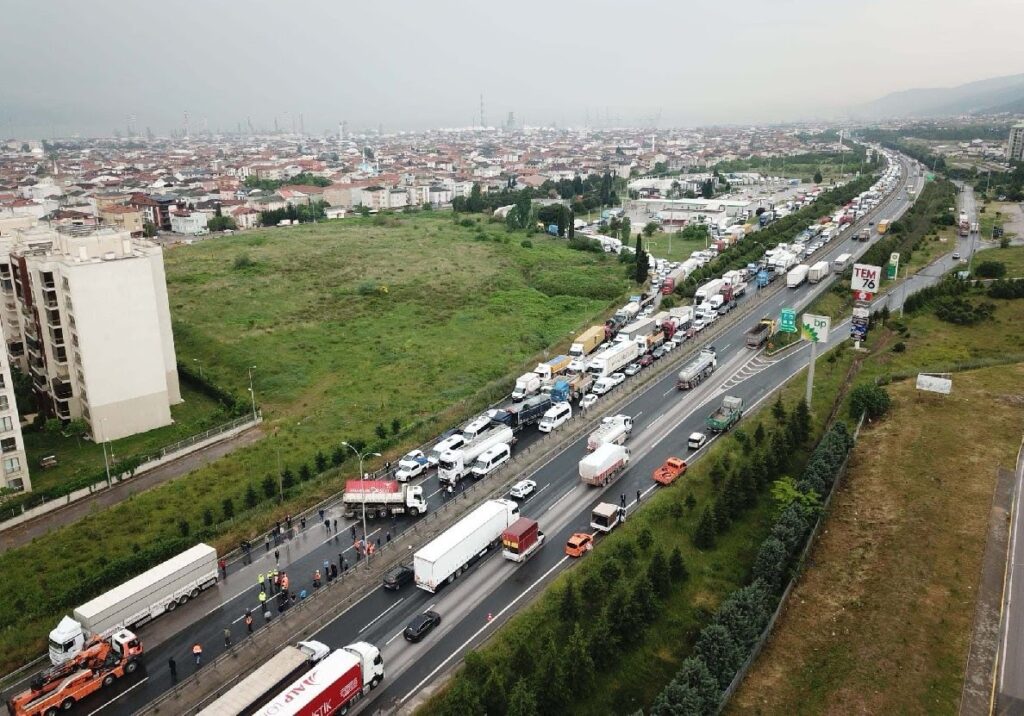Kocaeli’de TEM Otoyolu’nun Körfez geçişinde devrilen kamyon nedeniyle Ankara yönü ulaşıma kapandı. Yolda uzun araç kuyrukları oluştu.
