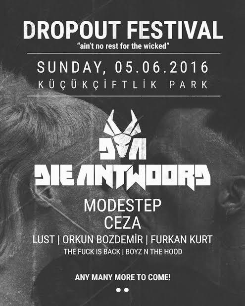 Bugüne kadar yayımladığı üç stüdyo albümü ve bu şarkıları için çektikleri birbirinden vurucu müzik videoları ile müzik endüstrisinde bütün ezberleri bozarak isimlerini zirveye yazdıran Die Antwoord, uzun zamandır beklenen destansı canlı performansı ile Türkiye’de ilk kez Dropout Festival kapsamında 5 Haziran’da KüçükÇiftlik Park sahnesinde olacak.