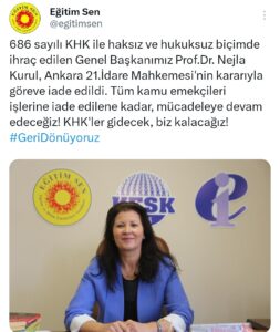 Prof. Dr. Kurul, Twitter hesabından “Sevgili dostlar! 686 sayılı KHK’yla haksız ve hukuksuz biçimde ihraç edilmiştim diğer kamu emekçileri gibi. Ankara 21. İdare Mahkemesi bu hukuksuz işlemin iptaline karar verdi, göreve iade edildim. Kimsenin KHK keyfiyetiyle karşılaşmayacağı bir ülke için mücadeleye devam!” açıklamasını yaptı.