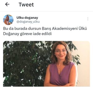 Prof. Dr. Doğanay ise; paylaşımında “Bugün idare mahkemesince Ankara Ü. İletişim Fakültesi’ndeki görevime iade edildim. Geç gelen adalete dair söyleyeceklerimiz baki, en yakın zamanda tüm Barış Akademisyeni arkadaşlarımın üniversitelerine dönmesini ümit ediyorum. Hayır gitmiyoruz, demiştik. Evet, nerede kalmıştık?” dedi.
