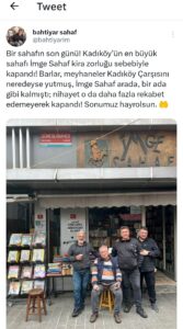 1998 yılından beri açık olan sahafın son günü sosyal medyada da dikkat çekti. Twitter üzerinden Bahtiyar Sahaf, “Bir sahafın son günü! Kadıköy’ün en büyük sahafı İmge Sahaf kira zorluğu sebebiyle kapandı!” diye yazdı.