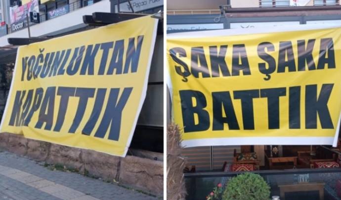 Dükkanın camına “Yoğunluktan kapattık” yazan esnaf, diğer tarafa ise “Şaka şaka battık” diye yazdı.
