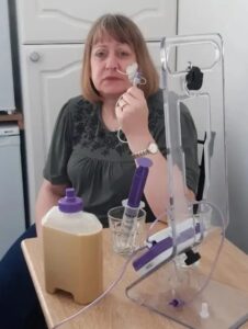 54 yaşındaki Tina Lamniai tüple besleniyor ve kusmadan hiçbir şey yiyip içemiyor .