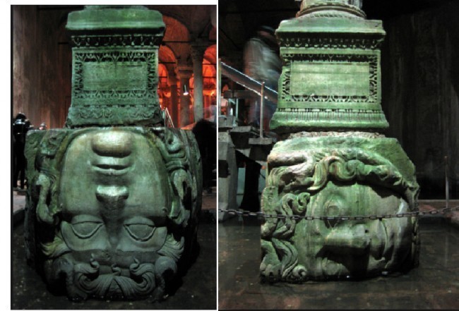 Yerebatan Sarnıcı’nda, biri yan biri ters biçimde konumlanmış olan ve kaide olarak kullanılan iki adet Medusa heykeli bulunmaktadır.