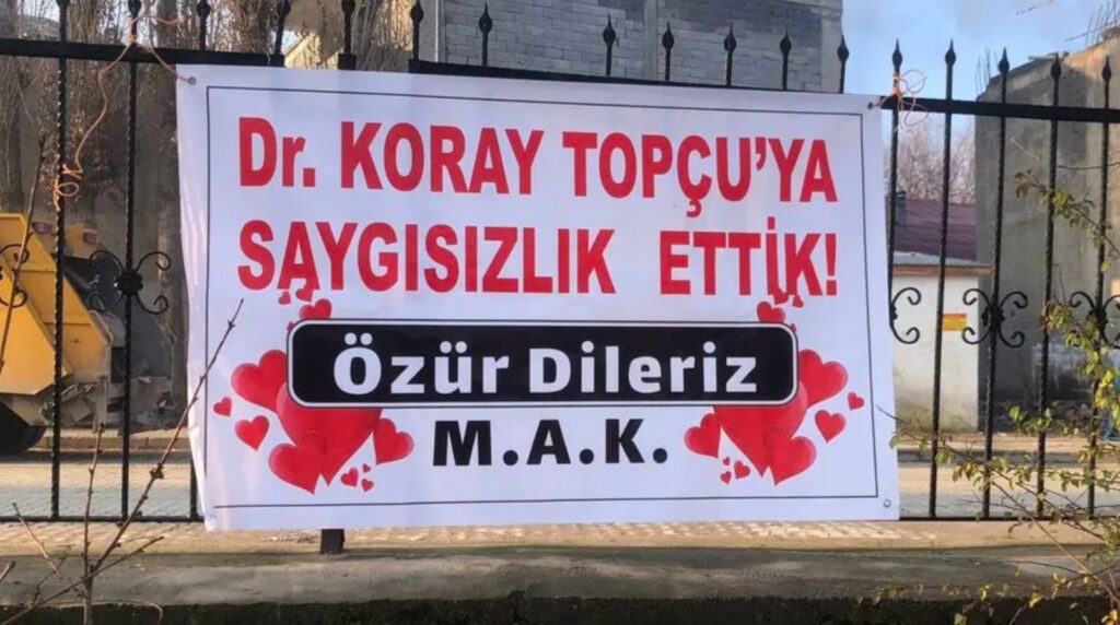Olay 21 Aralık günü yaşandı. Muş Hasköy Toplum Sağlığı Merkezi’ne giden hasta ile yakını burada görevli Doktor Koray Topçu ile tartıştılar. Hasta ve yakını ertesi gün sağlık merkezine giderek Doktor Topçu’dan özür dilediler. Bununla da yetinmediler sağlık merkezinin duvarındaki demir çitlere “Dr. Koray Topçu’ya saygısızlık ettik. Özür dileriz. M.A.K.” yazılı bir pankart astılar.