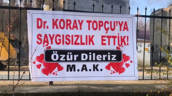 Olay 21 Aralık günü yaşandı. Muş Hasköy Toplum Sağlığı Merkezi’ne giden hasta ile yakını burada görevli Doktor Koray Topçu ile tartıştılar. Hasta ve yakını ertesi gün sağlık merkezine giderek Doktor Topçu’dan özür dilediler. Bununla da yetinmediler sağlık merkezinin duvarındaki demir çitlere “Dr. Koray Topçu’ya saygısızlık ettik. Özür dileriz. M.A.K.” yazılı bir pankart astılar.