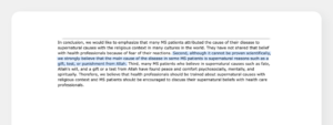 “Sonuç olarak, dünyadaki pek çok kültürde MS hastalarının hastalıklarının nedenini dini bağlamda doğaüstü nedenlere bağladıklarını vurgulamak isteriz. Bu inançlarını, tepkilerinden korktukları için sağlık profesyonelleri ile paylaşmazlar. İkinci olarak, bilimsel olarak kanıtlanamasa da, bazı MS hastalarında hastalığın ana nedeninin Allah’tan bir hediye, sınav veya ceza gibi doğaüstü nedenler olduğuna kuvvetle inanıyoruz. Üçüncüsü, kader, Allah’ın takdiri, Allah’tan bir hediye veya imtihan gibi doğaüstü sebeplere inanan birçok MS hastası psikososyal, zihinsel ve ruhsal olarak huzur ve rahatlık bulmuştur. Bu nedenle, sağlık profesyonellerinin doğaüstü nedenler konusunda dini bağlamda eğitilmesi ve MS hastalarının doğaüstü inançlarını sağlık profesyonelleriyle tartışmaya teşvik edilmesi gerektiğine inanıyoruz.”