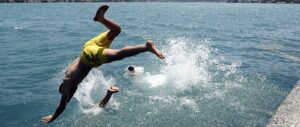 Üçüncü yarışma sporcularda cesaret ve beceri gerektiriyordu. Dile kolay, yalının yaklaşık 15 metre yüksekliğindeki çatısının üzerinden aşağıya ve ileriye doğru var güçleriyle atlayacaklar, öndeki 8 metre genişliğindeki taş rıhtımı aşarak denize balıklama dalacaklardı. Atlayışları sırasında yapacakları en ufak bir hata, hatta atlama sırasında yaşayacakları bir anlık kararsızlık, yaşamlarına mal olabilecekti. Tehlike büyüktü…Hakemler atlayıştaki tarza, güzelliğe ve suya değince yüzeyde bırakacakları su izine göre puan vereceklerdi…