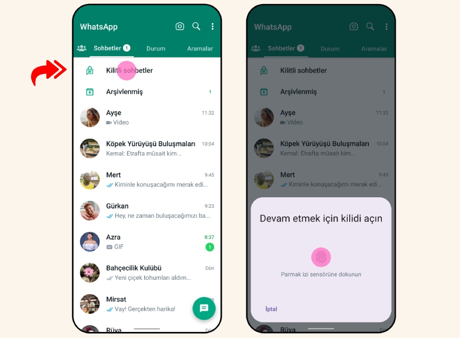 Güvenlik önlemi almak istediğiniz bir sohbeti basılı tutarak sadece “kilitle” seçeneğine dokunmanız yeterli olacak.