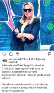 “Sevgili Suadiyeliler, 31.03.2024 yerel seçimlerinde bana ve ekibime desteklerinizle oy verip kazanmamızı sağlayan herkese çok teşekkür ederim. Yeni dönemde sizlerle birlikte mahallemize güzel hizmetler katmaya devam edeceğiz sevgi ve saygılarımla. Muhtarınız Hilal Hülya Özdemir.”