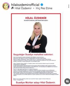 Türk halk müziği sanatçısı Hilal Özdemir, sosyal medya hesabından İstanbul Kadıköy Suadiye Mahallesi’nden muhtar adayı olduğunu duyurmuştu.