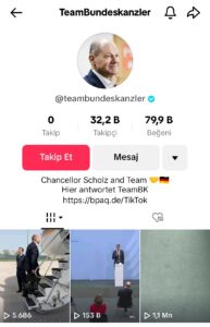 Özellikle genç kullanıcılara hitap etmek için açılan TikTok hesabında, Federal Şansölye Olaf Scholz’un çalışmalarına ve hükümet politikasına ilişkin bilgilere ek olarak yorum, soru ve önerilere de yer verileceği kaydedildi.