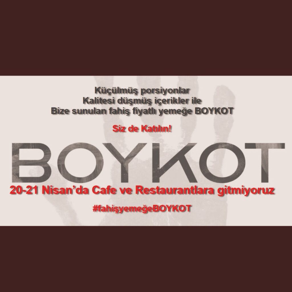 Yarın ve cumartesi (20-21 Nisan) dışarıda yiyip içmeme kararı alan sosyal medya kullanıcıları “Küçülmüş porsiyonlar, kalitesi düşmüş içerikler ile bize sunulan fahiş fiyatlı yemeğe boykot! Siz de katılın! 20-21 Nisan’da kafe ve restoranlara gitmiyoruz” şeklinde paylaşım yaptı.
