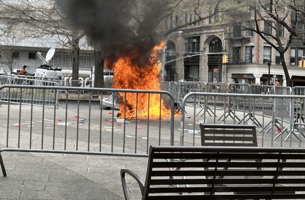 Maxwell Azzarello kendini yakmadan bir gün önce Trump’un yargılandığı sus payı davasının görüldüğü mahkemenin önünde elindeki pankartla dikkat çekmiş ve fotoğraflanmıştı. Pankartta “Trump ve Biden birlikte bize faşist darbe yapmak üzereler” yazıyordu.
