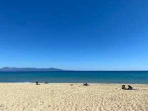 Sıcaklık 20 derece civarında ama rüzgâr var. Yarım saat gidiyoruz Nea Peramos’taki Ammolofoi Beach’e. Plaj, ince, sarı kumla kaplı, denizi de oldukça berrak. Palmiyeler gölgesinde uzanmanız için sizi davet ediyor. Çevrede kalınabilecek tesisler de var. Burası turistlerin tercih ettiği plajlar arasındaymış. Bizim gittiğimiz tarihte (8 Nisan) sezon açılmadığından plajda hazırlıklar sürüyordu. Yoksa Haziran’dan itibaren burası ana-baba günü olur. Biraz uzakta yere serdikleri havluya uzanmış iki sevgili var: Belki de gözlerden uzak olmanın verdiği rahatlıkla öpüşüyorlar. Bizim 50 metre ilerimizde de çocuklarıyla gelmiş bir aile var. Üstelik denize de giriyorlar.
