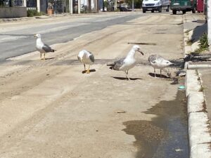Oranın yakınındaki bir tatil köyüne uğruyoruz. Yaza hazırlık sürüyor. Siesta zamanı olduğundan pek insan yok dışarda. Biz de alışıyoruz buna. Deniz yakın olduğundan martılar yiyecek arayışında.