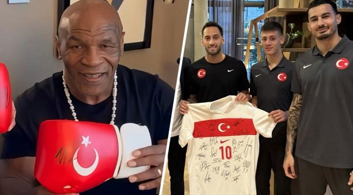 Tarihin gelmiş geçmiş en iyi boksörlerinden olan Mike Tyson, A Milli Takım’ın Avusturya ile oynanacak maçta Türkiye’den taraf olduğunu belirterek kendisi için özel yaptırılmış olan ve Türk bayrağını taşıyan boks eldivenlerine imzasını attı.