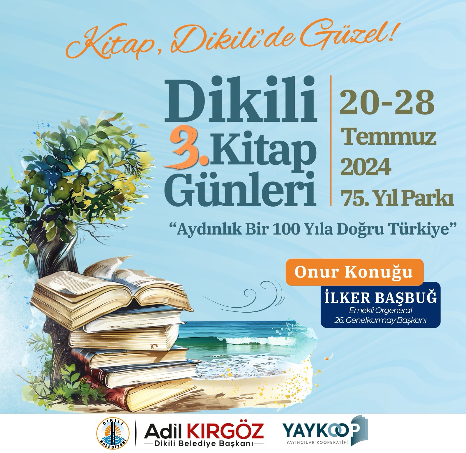Dikili Belediyesi ve Yayıncılar Kooperatifi iş birliğiyle bu yıl üçüncüsü gerçekleştirilen Dikili Kitap Günleri, “Aydınlık Bir 100 Yıla Doğru Türkiye” temasıyla 20 Temmuz’da kitapseverleri ağırlayacak.