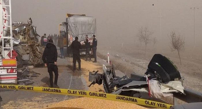 Konya-Ankara kara yolunda öğle saatlerinden itibaren etkili olan toz taşınımı, zincirleme kazaya neden oldu.