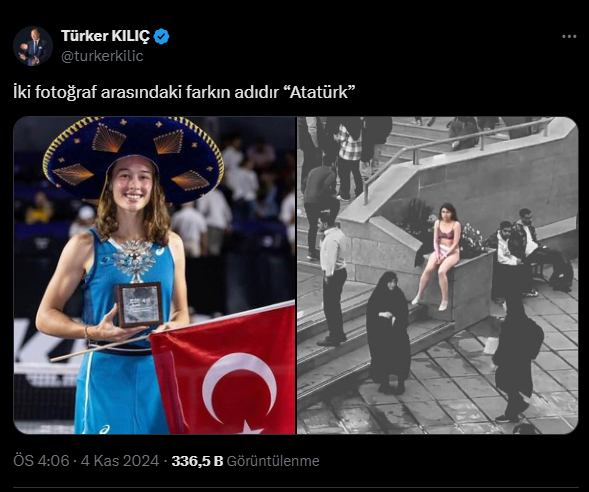 Bir tarafta tarihi bir başarıyla, elinde Türk bayrağı ve ödülüyle poz veren Zeynep Sönmez, diğer tarafta Tahran’daki İslam Azad Üniversitesi’nin kampüsünde genç bir kadının iç çamaşırlarıyla gerçekleştirdiği protesto fotoğrafını kullanan Kılıç: