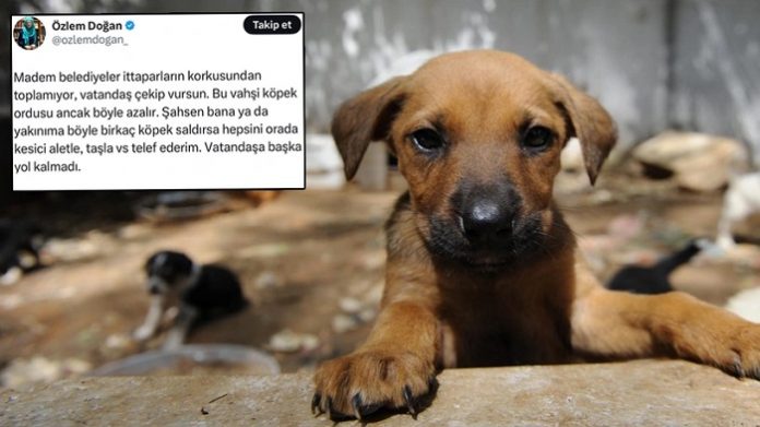 Özlem Doğan, X hesabından yayımladığı paylaşımda, “Madem belediyeler ittaparların korkusundan toplamıyor, vatandaş çekip vursun. Bu vahşi köpek ordusu ancak böyle azalır. Şahsen bana ya da yakınıma böyle birkaç köpek saldırsa hepsini orada kesici aletle, taşla vs telef ederim. Vatandaşa başka yol kalmadı” diyerek hem hayvanları katliam hedefi olarak gösterip hem de hayvanseverlere hakaret etti.