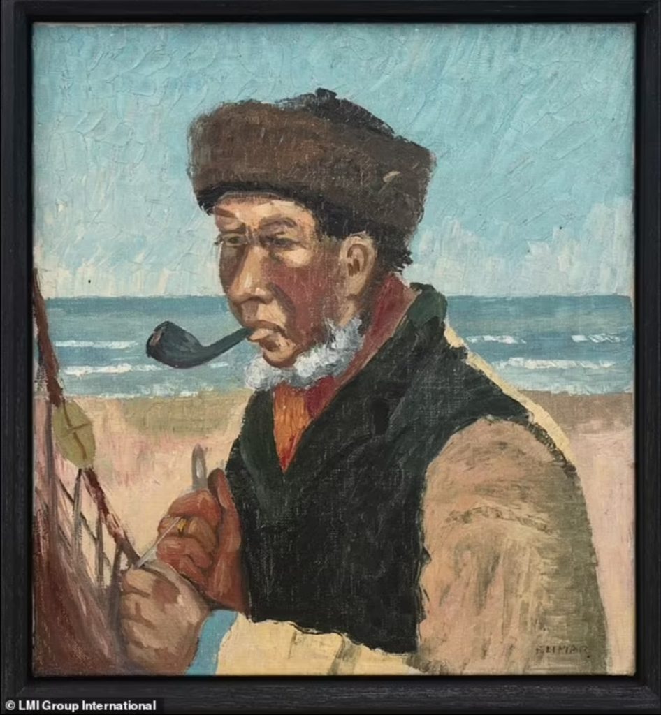 Eserde, ıssız bir sahilde ağını onarırken piposunu içen bir balıkçı yer alıyor.