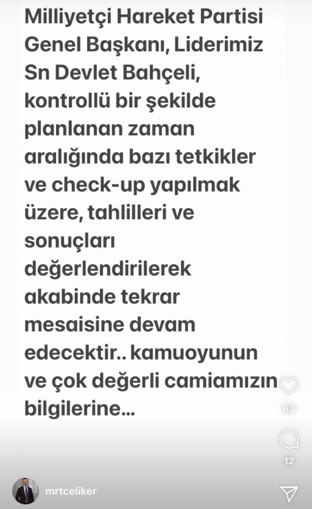 Devlet Bahçeli’nin Özel Kalem Müdürü Murat Çeliker Bahçeli’nin sağlık durumuyla ilgili açıklama yaptı.