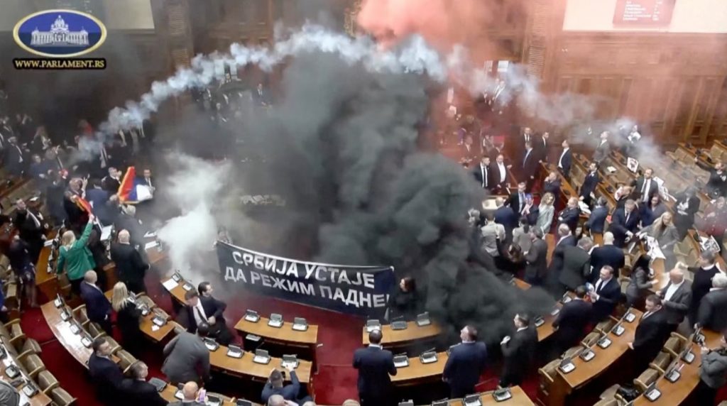 Sırbistan Parlamentosu’nda meclisin gündemine dair tartışmalar üzerine kavga çıktı ve muhalefet milletvekilleri salona sis bombaları ve göz yaşartıcı bombaları attılar.