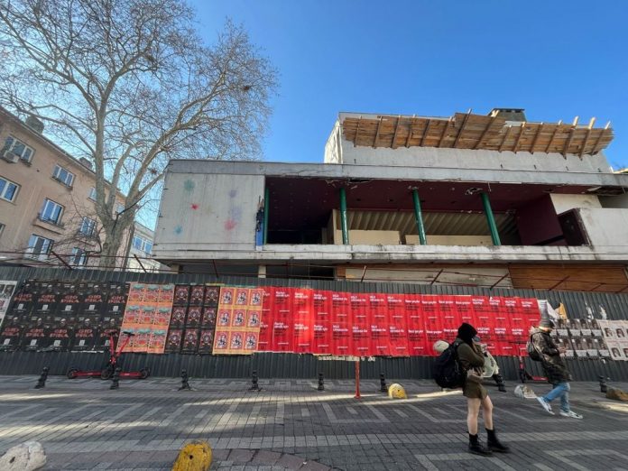 Fotoğraflarda, Kadıköy’ün hafızasını oluşturan sanat merkezlerinden biri olarak kabul edilen Reks Sineması’nın yıkımını gizlemek için alana paravan döşendiği görülüyor.