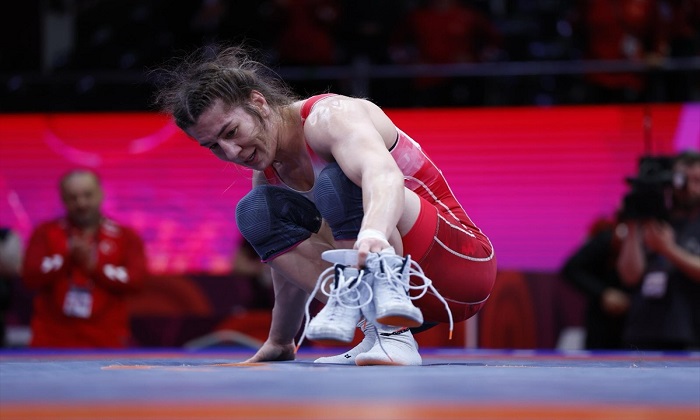 Avrupa Güreş Şampiyonası finalinde Ukraynalı Anastasiya Alpyeyeva’ya mağlup olan Yasemin Adar Yiğit, maç sonu minderde ayakkabılarını çıkararak spora veda etti.