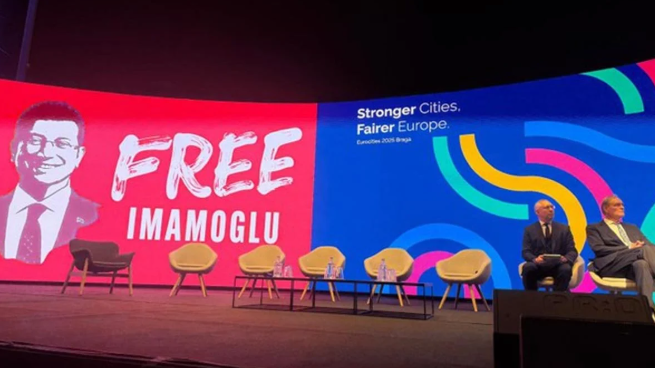 Portekiz’de düzenlenen Eurocities 2025 zirvesinde, sahnede “Free İmamoğlu” görseli kullanıldı.