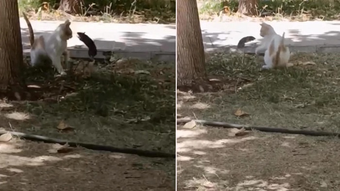 Görüntülerde, kedinin fareden korktuğu ve geri çekildiği, farenin ise cesur bir şekilde kedinin üzerine zıpladığı görüldü.