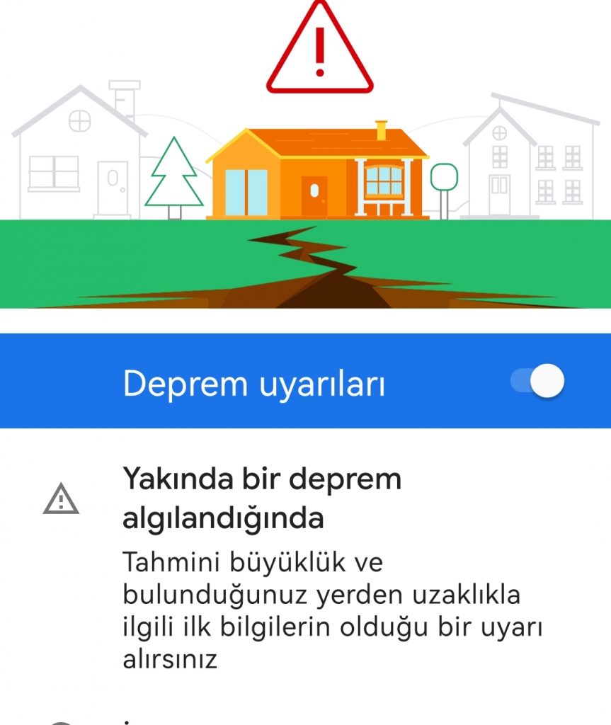 Android deprem uyarı sistemini aktif hale getirmek için telefonun “Ayarlar” menüsüne gidin. Daha sonra Konum-Gelişmiş-Deprem Uyarıları adımlarını takip ederek deprem uyarı sistemini açabilirsiniz veya Ayarlar bölümüne gidin. “Acil durum” seçeneğine basın. Deprem uyarıları sayfasını göreceksiniz. “Uyarıları aç” tuşuna basarak aktif hale getirebilirsiniz