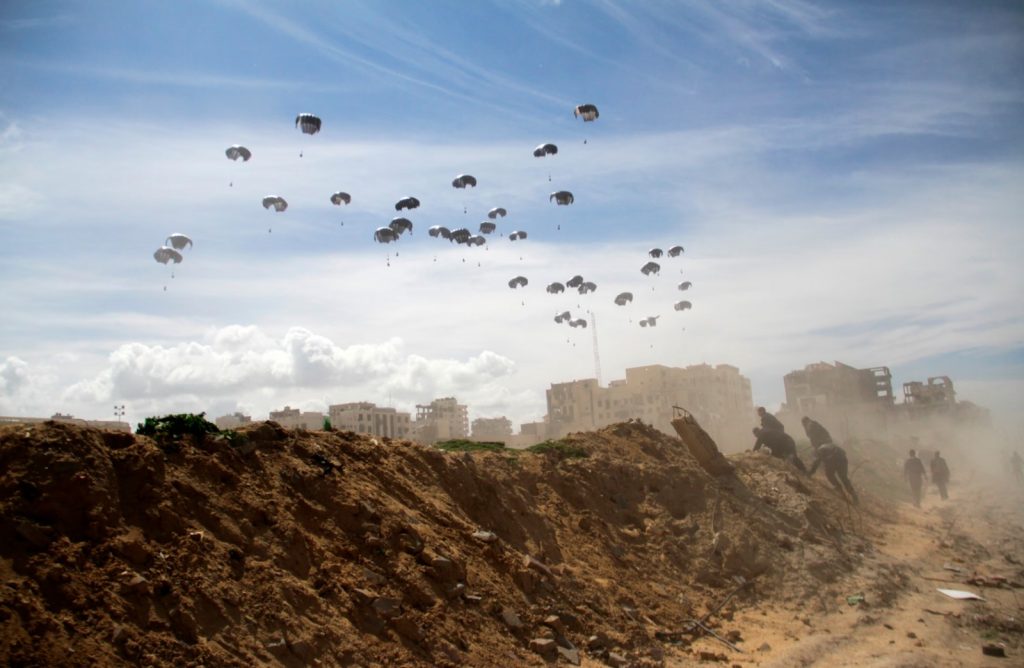 İsrail’in karadan ablukasına karşı bulunan güya çarelerden biri uçaklardan paraşütlerle yardım atmak. ABD’nin Ürdün üzerinden gerçekleştirdiği bu yöntem aşağıda büyük kaosa yol açıyor ve bazen havadan atılan yardım sandıkları insanları ezerek ölümlere neden oluyor.