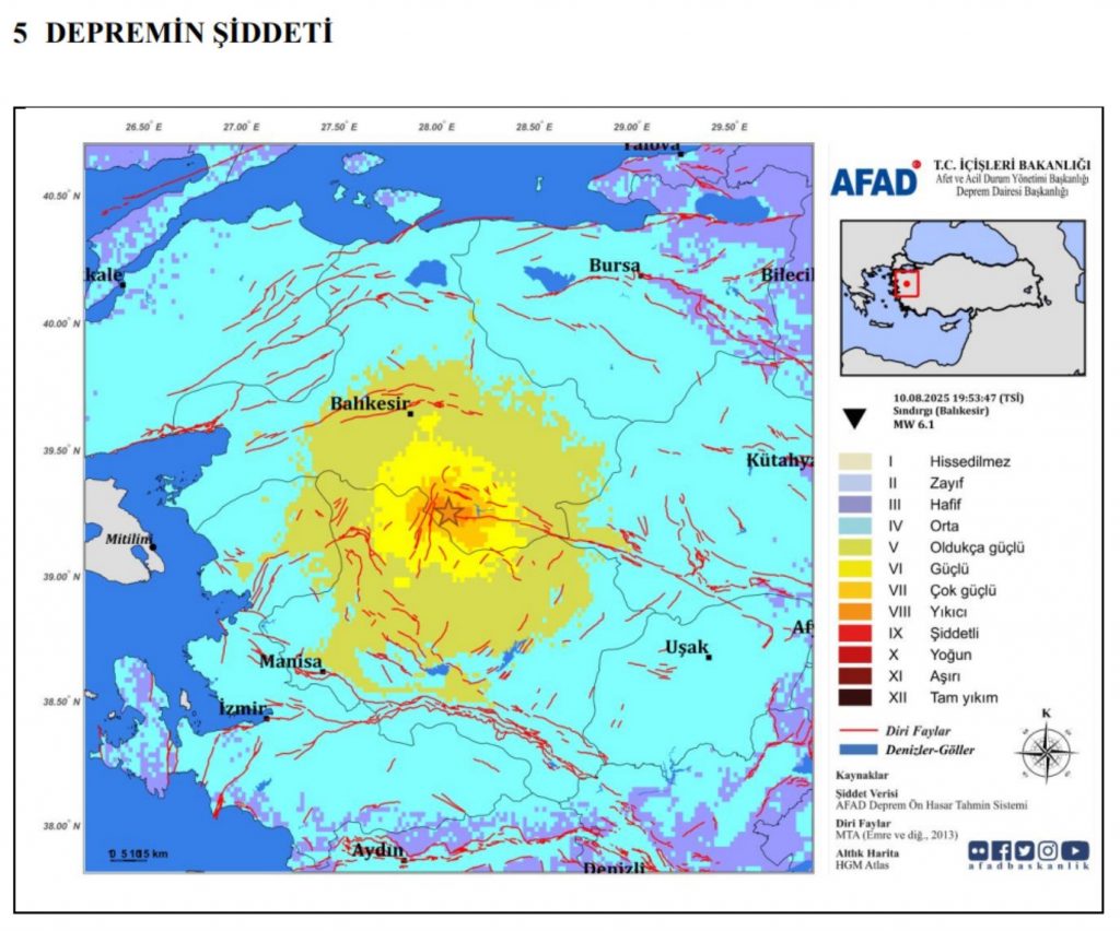 Deprem haritasına göre, Sındırgı’da deprem 8 şiddetinde hissedilirken, Balıkesir ve Manisa çevresinde yıkıcı, çok güçlü (7), güçlü (6) ve oldukça güçlü (5) şiddetinde etkiler gözlemlendi. Bu veriler, bölgedeki yapıların ve altyapının ciddi şekilde etkilenebileceğini gösteriyor.