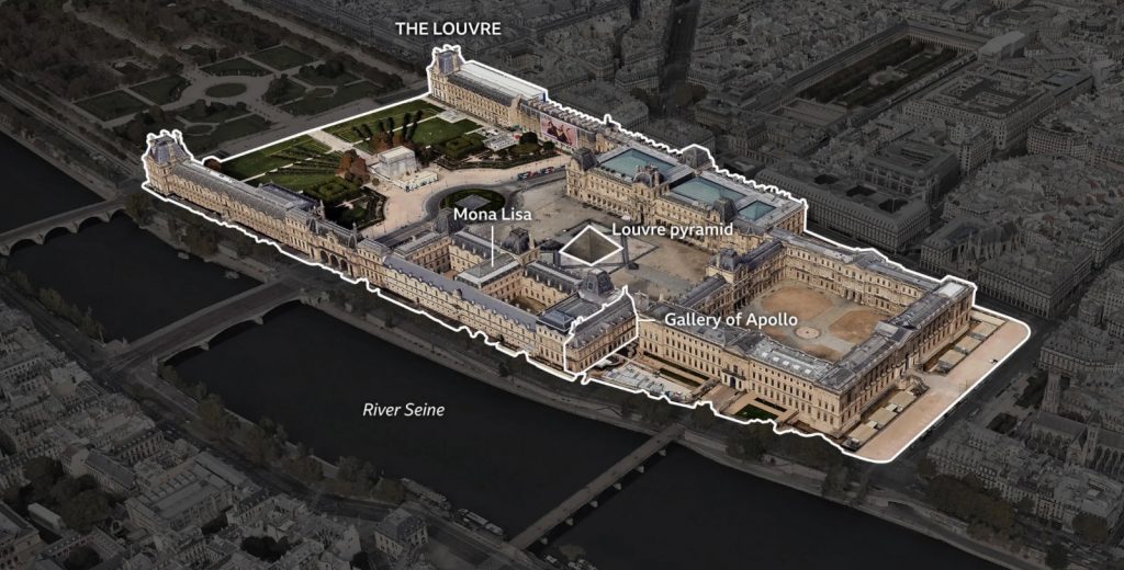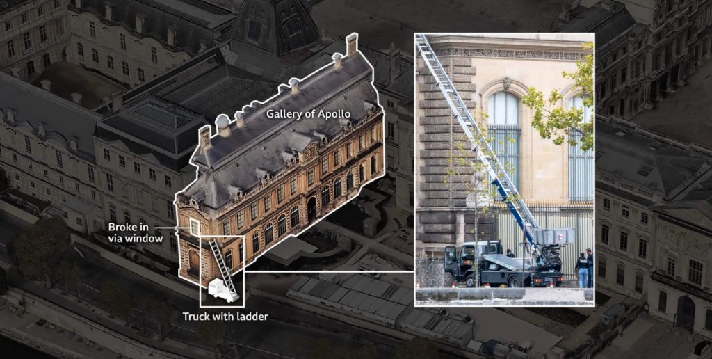 Louvre Müzesi’nin açılış saati olan 09.00’dan yarım saat sonra soyguncular, müze görevlileri ziyaretçi akınıyla meşgulken müzenin Seine Nehri’ne bakan yüzünde Fransa Kraliyet mücevherlerinin sergilendiği Apollo Galesi binasının yanına merdivenli bir kamyon yanaştırdılar.