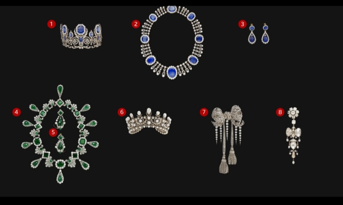 Soyguncuların çaldıkları parçalar: 1-3: Kraliçe Hortense ve Kraliçe Marie Amelie’nin taktığı taç, kolye ve bir çift küpe. 4-5: Napolyon Bonapart’ın ikinci eşi Marie-Louise’e düğün hediyesi olarak verdiği zümrüt kolye ve küpeler. 6-7: İmparatoriçe Eugénie’nin inci ve elmas taç ve elmas broşu. 8: ‘Kutsal emanet broşu’ olarak bilinen broş