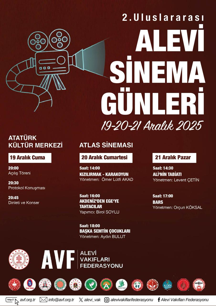 Alevi Vakıfları Federasyonu tarafından düzenlenen 2. Uluslararası Alevi Sinema Günleri, bu yıl 19–21 Aralık 2025 tarihleri arasında Atlas Sineması’nda sinemaseverlerle buluşacak. Etkinlik, Alevi-Bektaşi inanç ve kültür mirasını sinema aracılığıyla görünür kılmayı ve kolektif hafızayı güçlendirmeyi hedefliyor.