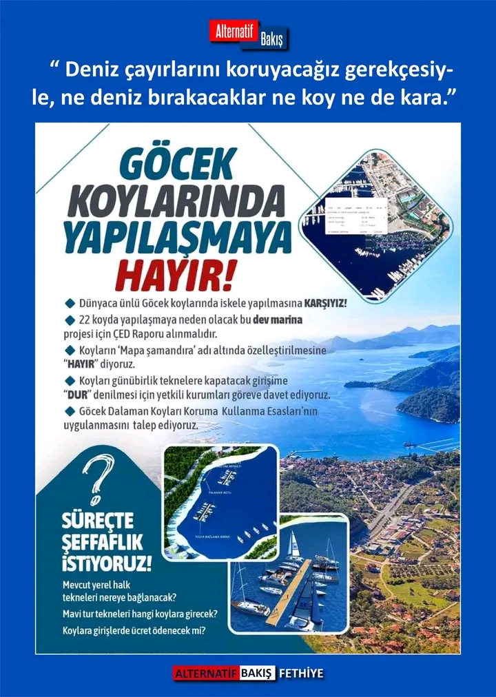 Göcek koylarına mapa şamandıra adında koca bir marina ya da yat parkı yapıyorlar. Projeye itiraz ettik, iptal edilmesi için dava açtık. Davamız halen devam ediyor. Ama bir yandan da şirket mapa ve şamandıraları yerleştiriyor.